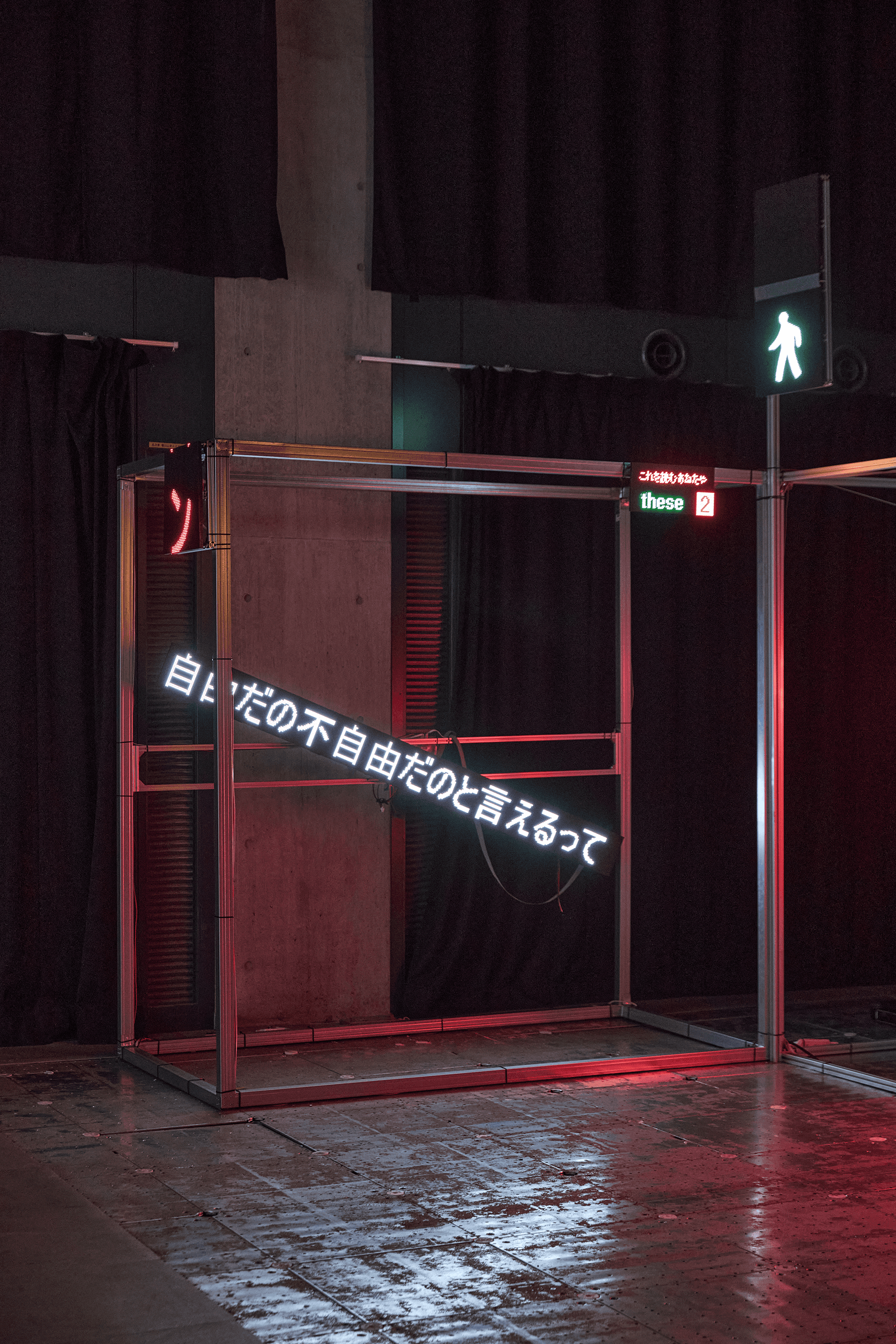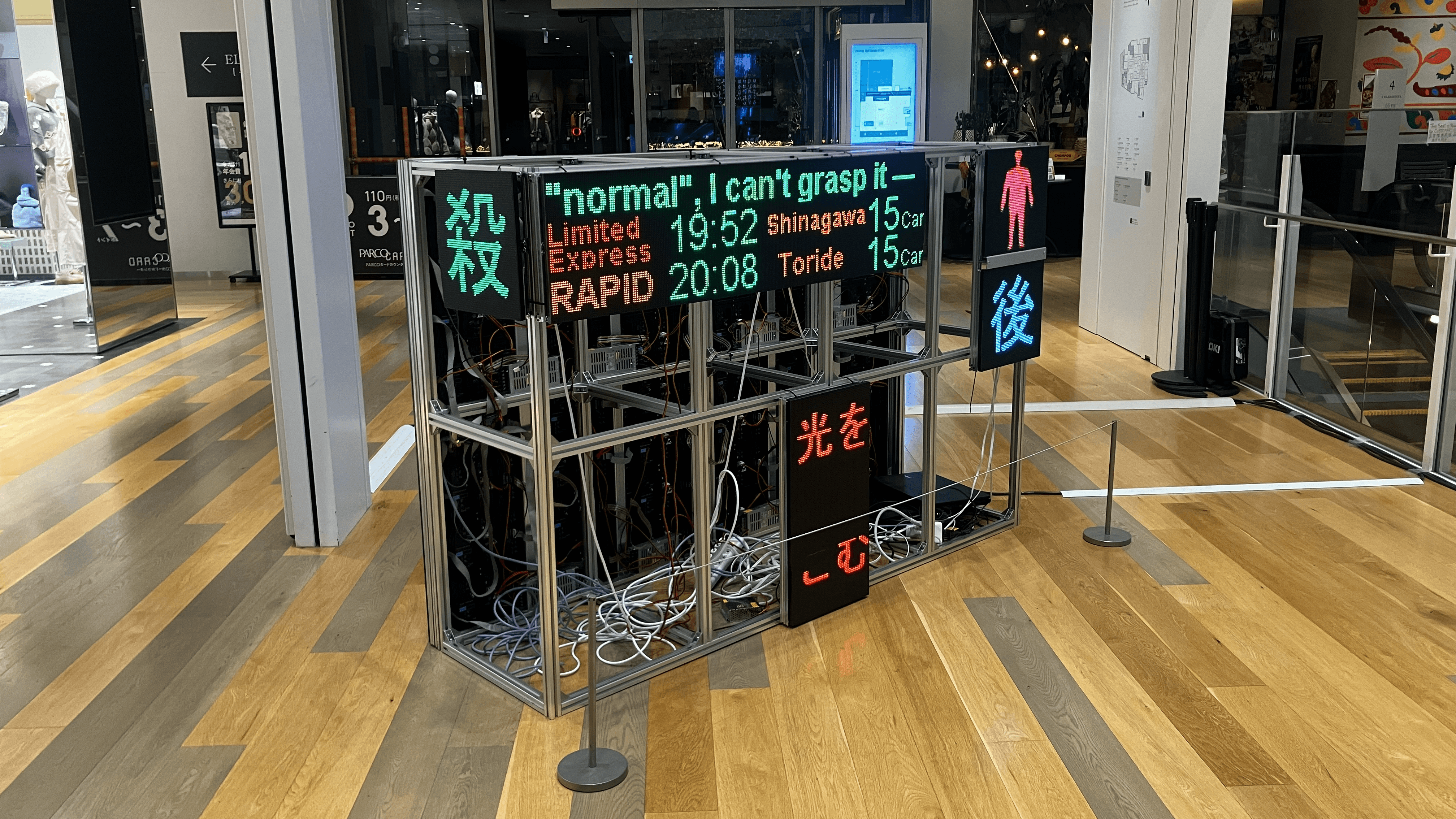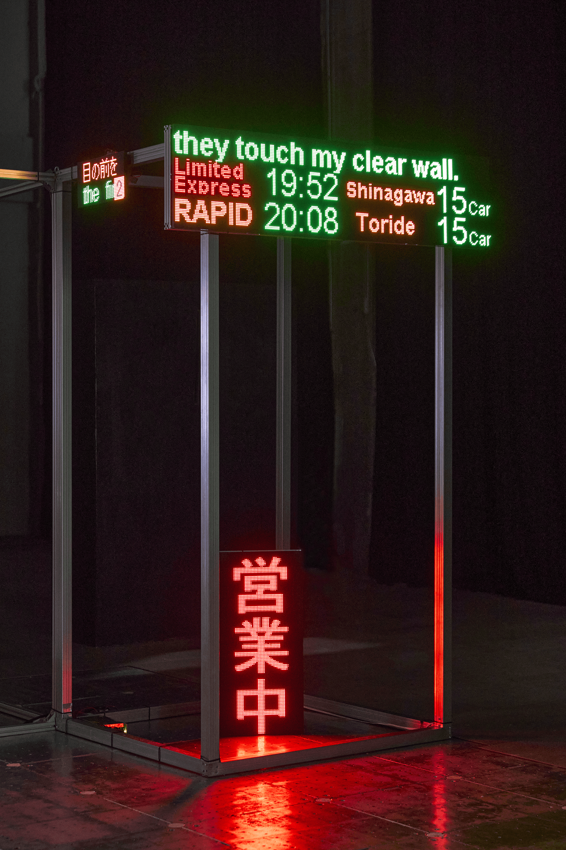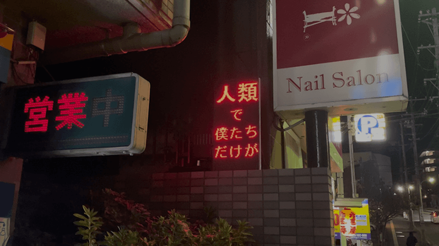 《外側へ向けられた内なる言葉》は、都市の日常風景に溶け込む電光掲示 板というメディアを用い、私自身の言葉を街に持ち込むというパフォー マンスから発展したインスタレーション作品だ。この作品は、映像と電 光掲示板を媒介に、言葉の在り方とその伝播のプロセスを社会に問いか ける試みである。 本作品が目指すのは、外の世界から拾い集めた言葉を詩へと再構築し、 その言葉を再び社会に還元するという循環的な行為だ。これは内面を覗 かせるためのものではなく、むしろ内なる言葉を外部に向けて解放し、 社会との新たな接点を生み出す試みでもある。