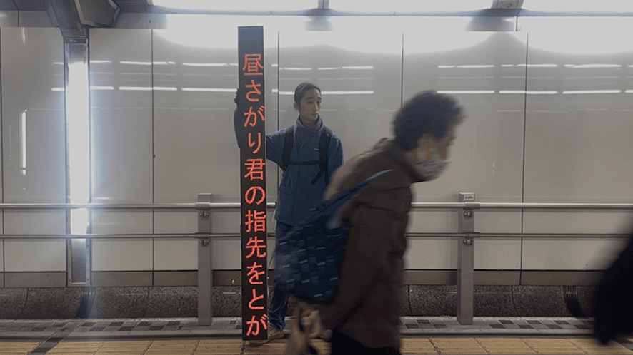 The forms of poetry and tanka are, for me, a medium for chewing on society and encouraging dialogue after deep introspection. It is a form of open language that does not convey a direct message, but rather evokes the interpretation of the recipient. And I chose the medium of electronic billboards because the words posted on them are “necessary” and because they are something that people unconsciously catch the eye of on a daily basis. By bringing poetic words into the city through this medium, we create a situation where words that would normally be considered “unnecessary” are inevitably read as an extraordinary presence.