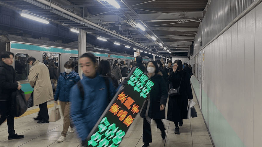 詩や短歌という形式は、私にとって社会を咀嚼し、深く内省した上で対 話を促すための媒体である。それは、直接的なメッセージを伝えるので はなく、受け手の解釈を喚起する、開かれた言葉のかたちだ。 そして、電光掲示板というメディアを選択したのは、そこに掲載される 言葉が「必要」とされるものであり、人々が日常的に無意識のうちに 目を留めてしまう存在である点に着目したからだ。このメディアを通じ て詩的な言葉を街に持ち込むことで、普段は「不要」とされるはずの言 葉が非日常的な存在としてどうしても読まれる状況を生み出すだろう。